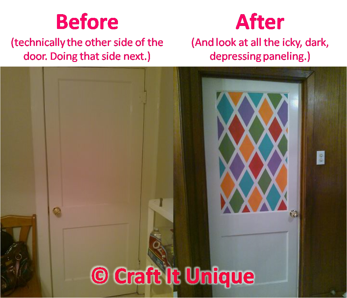 See! Doesn't it look soooo much better? Also look at that horrible paneling. Ugh. I have a plan for that too. Also for the bottom panel of the door, but all that's for a little later.
