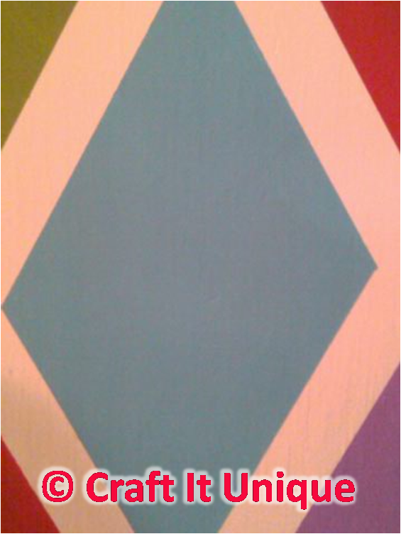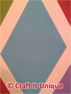 Now for the fun part! TIME TO PAINT!! Not yet. Psyched you out didn't I? One more step before painting. I basically had 5 colors that I wanted to incorporate into the door: Red, a groovy pea green, teal blue, orange, and purple. And I didn't want any of the diamonds to be next to a diamond of the same color so i took that into account when I was marking which diamonds were which color. I put a little code on the wood itself to mark which were which color. "B" for blue, p for purple...you get the idea.